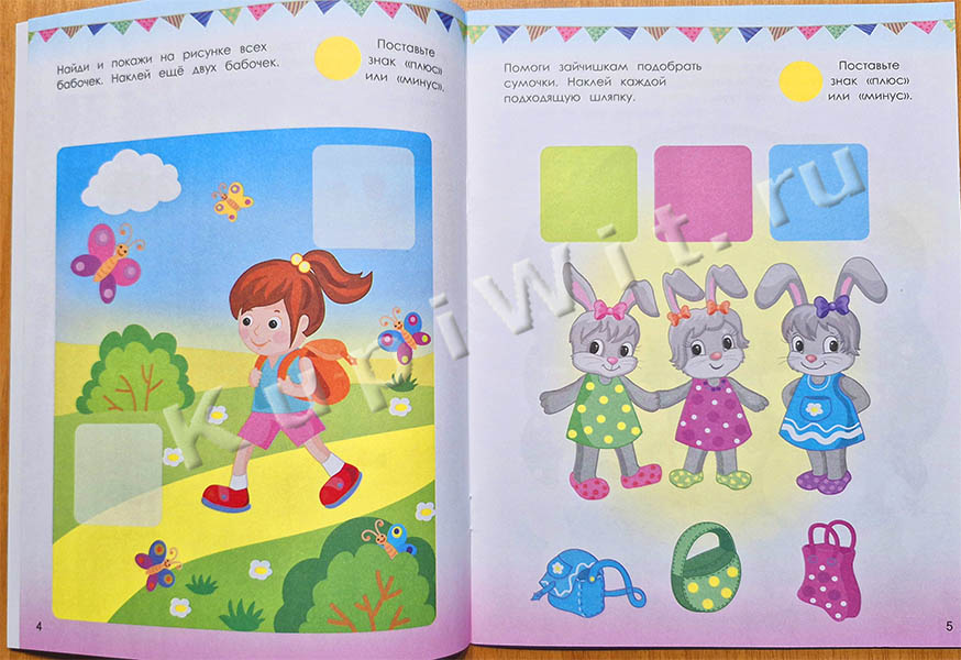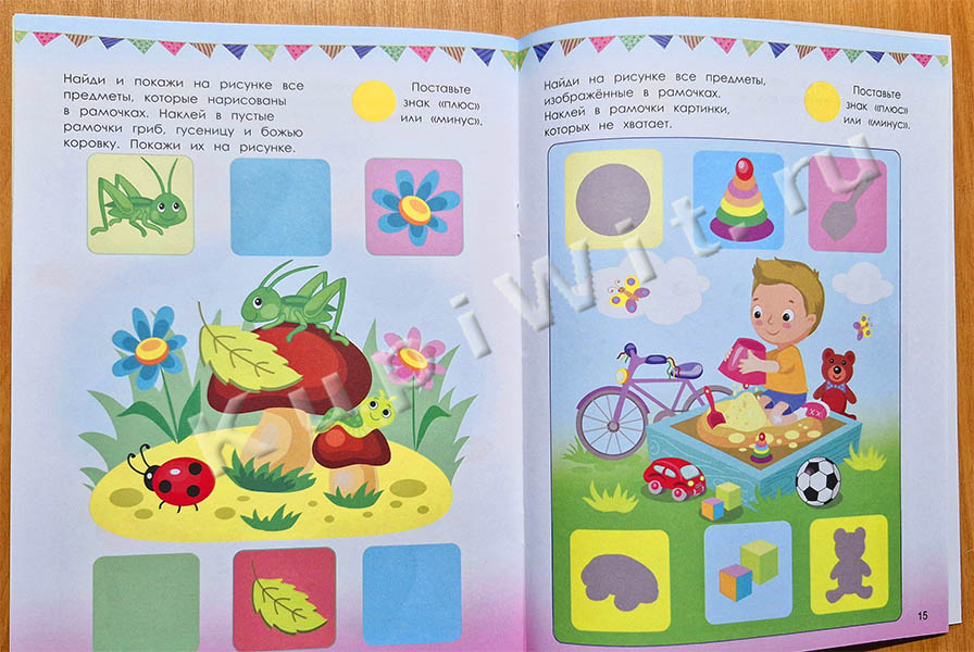 Занимаясь по книжке, вы проверите, как развиты восприятие и внимание у вашего малыша. А наклейки помогут сделать занятия более увлекательными. Объясните ребёнку каждое задание, предоставьте возможность выполнить его самостоятельно. Допускается небольшая помощь взрослого.