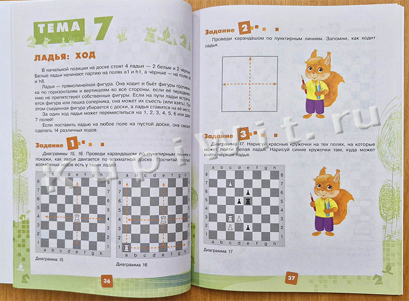 Вместе с ребёнком вы будете решать интересные шахматные задачи, проходить извилистые лабиринты, раскрашивать фигуры и многое другое.»