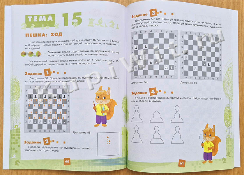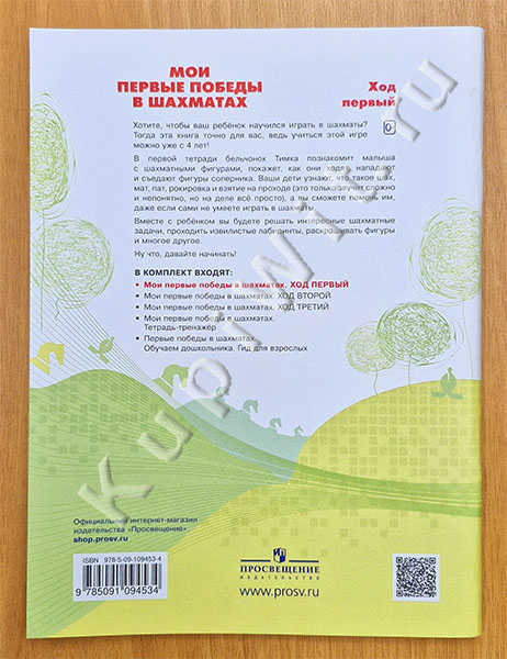 «Хотите, чтобы ваш ребёнок научился играть в шахматы? Тогда эта книга точно для вас, ведь учиться этой игре можно уже с 4 лет! В первой тетради бельчонок Тимка познакомит малыша с шахматными фигурами, покажет, как они ходят, нападают и съедают фигуры соперника. Ваши дети узнают, что такое шах, мат, пат, рокировка, взятие на проходе (это только звучит сложно и непонятно, но на деле всё просто), а вы сможете помочь им, даже если сами не умеете играть в шахматы.