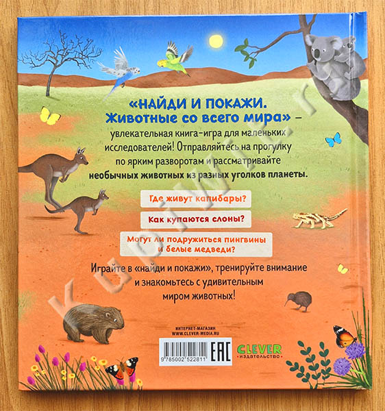 «Увлекательная книга-игра для маленьких исследователей! Отправляйтесь на прогулку по ярким разворотам и рассматривайте необычных животных из разных уголков планеты.
