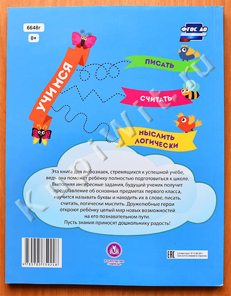 Книга поможет ребёнку полностью подготовиться к школе: называть буквы и находить их в слове, писать, считать, логически мыслить.