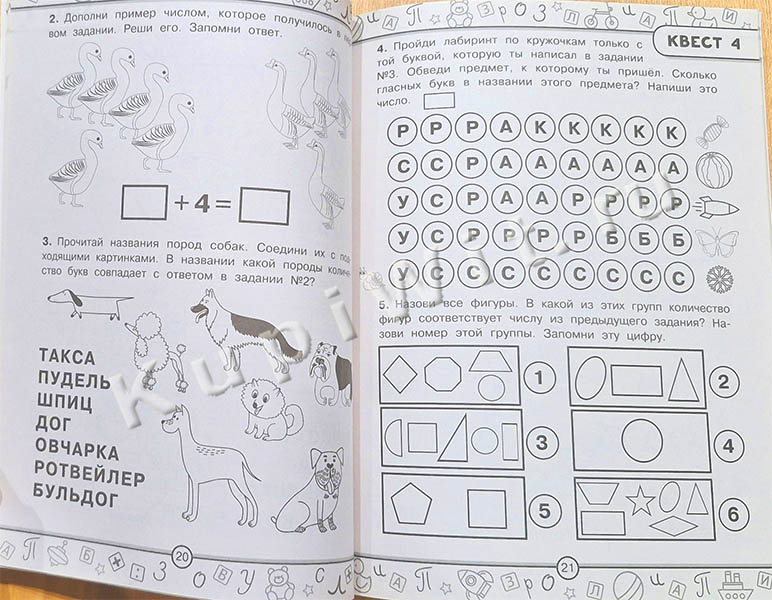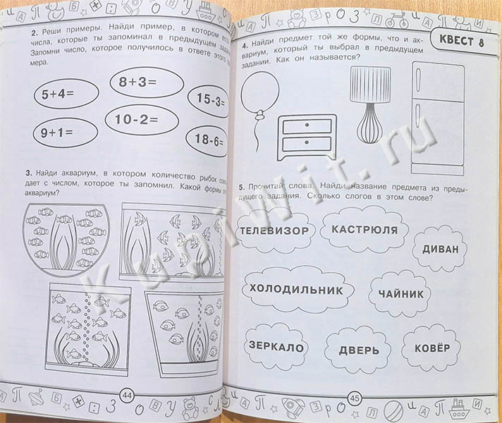 определить маршрут рыбки при её движении только по гласным буквам; посчитать картинки в каждом ряду; измерить высоту домов в сантиметрах и найти дом по числу из предыдущего задания; разгадать, какое двузначное число получается в каждом примере; подсчитать сумму чисел на каждой дорожке и найти нужную дорожку; определить, какое насекомое доберется до картинки из предыдущего задания; разделить слова на слоги, записать их количество и раскрасить птицу в названии которой столько же слогов, сколько в названии насекомого из предыдущего задания; сосчитать и записать количество букв в названии каждой птицы на картинке, решить примеры на сложение и вычитание.