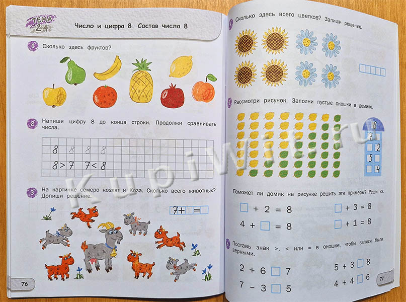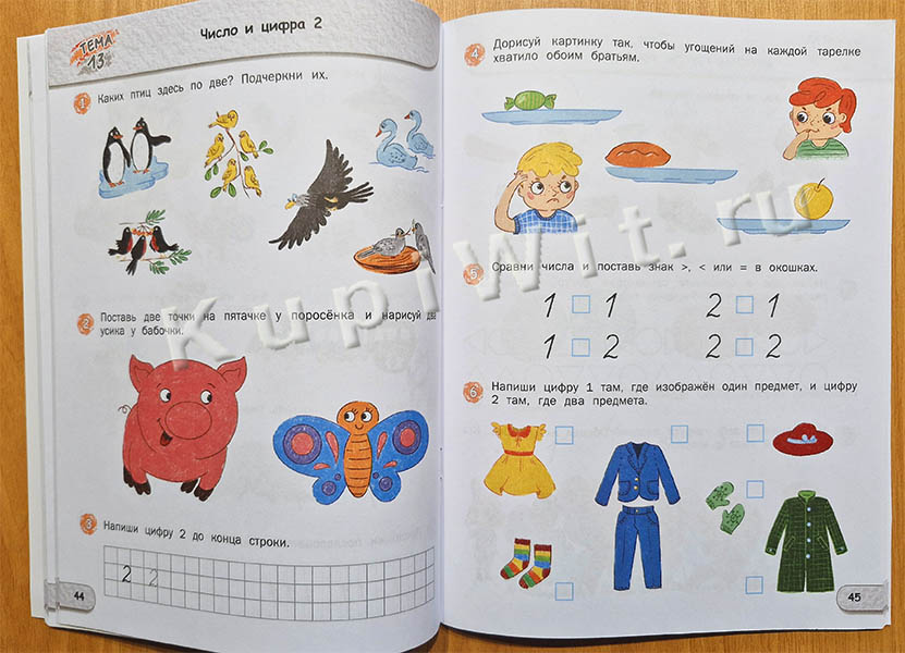 …Система занятий построена так, чтобы, начиная с представлений о свойствах предметов, их сравнении, пространственных отношениях, дети овладели навыком счета в пределах первого десятка и познакомились с базовыми геометрическими фигурами. Выполняя задания, дети получат представление о понятии задача, освоят сложение, вычитание и сравнение количества предметов, а также научатся записывать вычисления, использую математические знаки.
